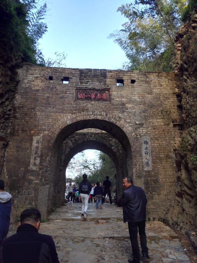 “一脚踏两省”的梅关古楼城门是像古老城门一样的砖体建筑,这里石壁对峙,地势险要,有“一夫当关、万夫莫开”之势,又是南北来往的重要关卡,所以历来是兵家必争之地。行步在这条古驿道上,脑海中不禁浮现出古代中原地区老百姓南迁时携家带口的景象、以及革命时期陈毅同志藏身山野还吟诗作赋《梅岭三章》的大将风范。