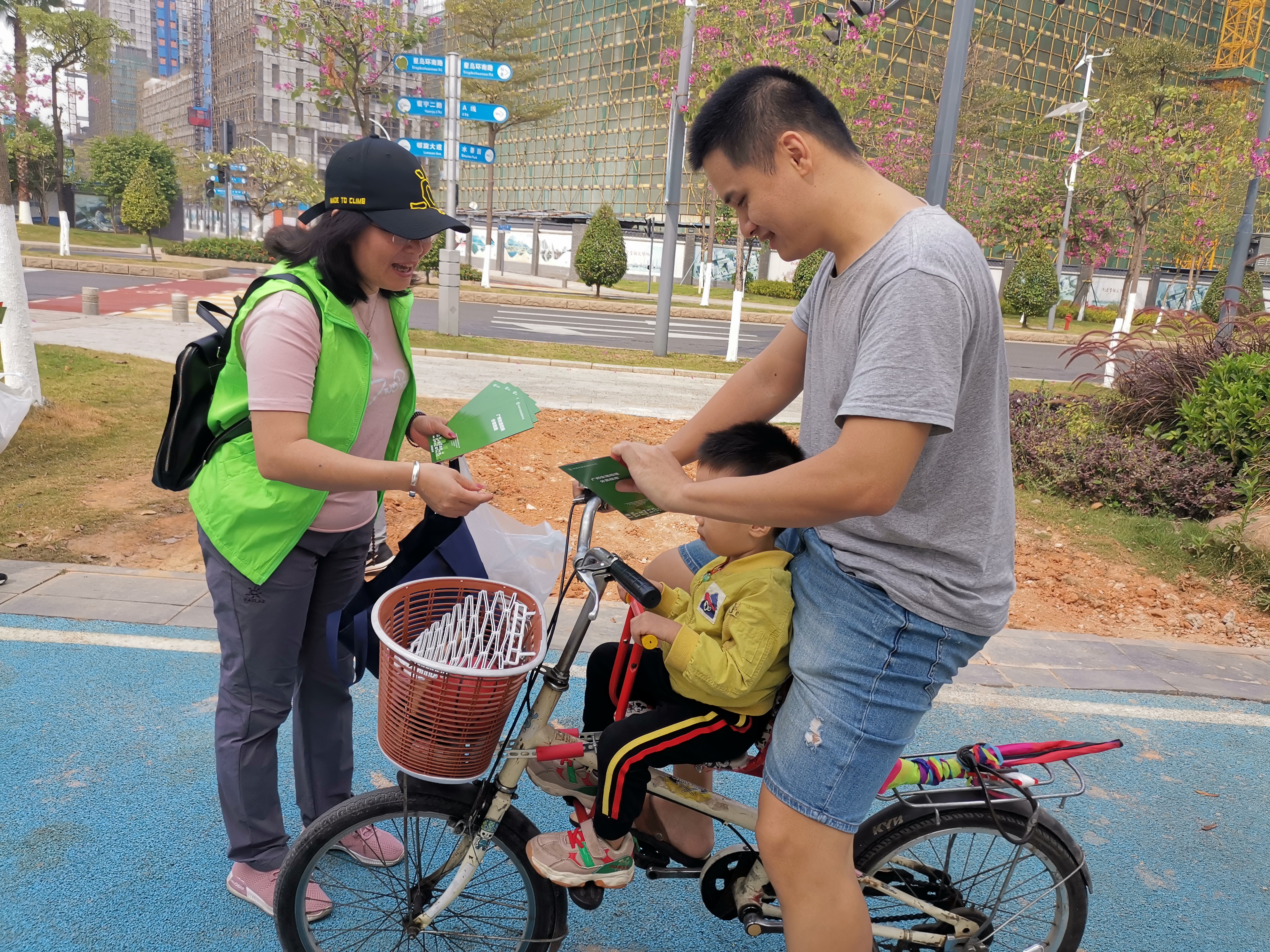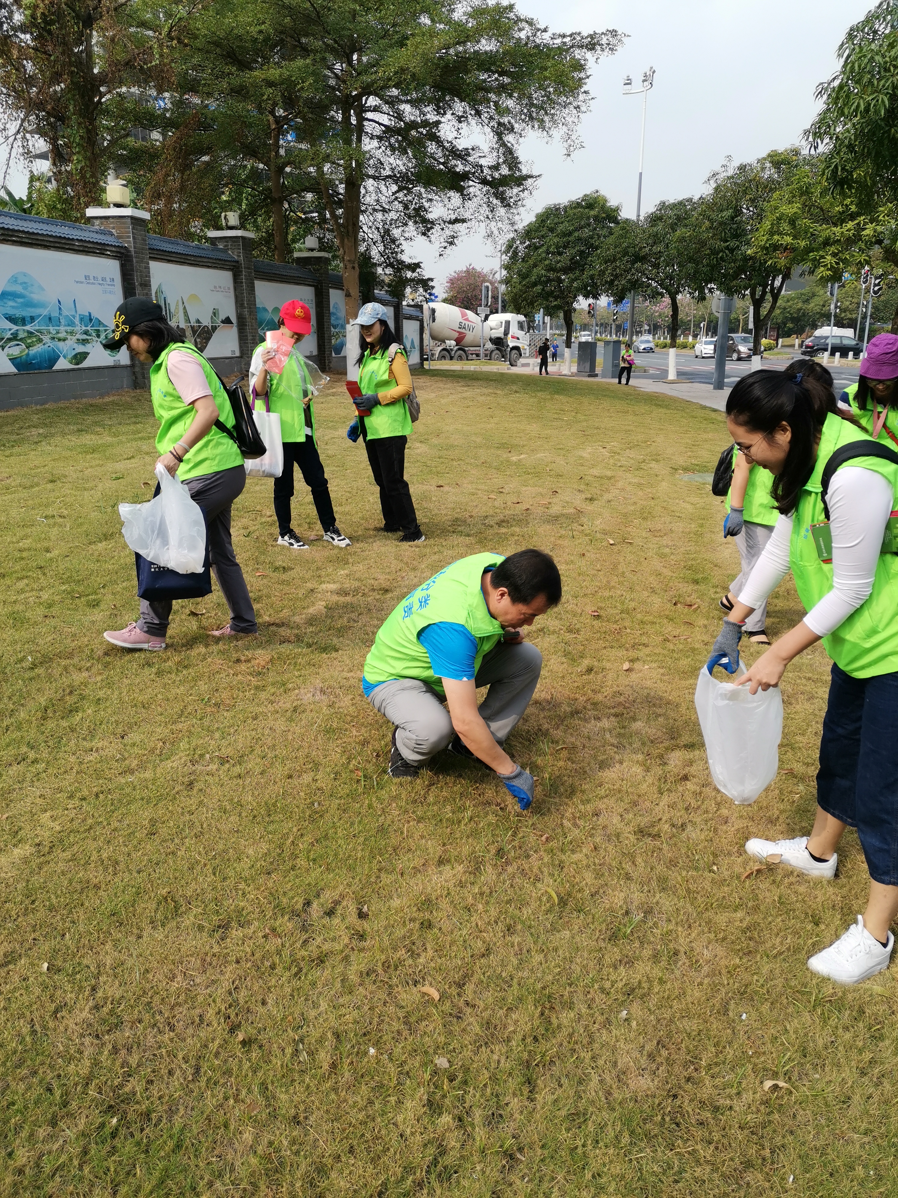 生物岛内垃圾主要以纸屑、烟头、塑料瓶、建筑废料为主,由于在草坪上用扫把难以清洁,各党员均不怕辛苦不怕脏地用手一点一点的在地上捡拾垃圾,并放到随身携带的垃圾袋中。除了垃圾清理以外,还为经过的行人派发垃圾分类宣传单,呼吁人们“爱护环境、保护环境”,宣扬一种与时俱进的环保理念。
