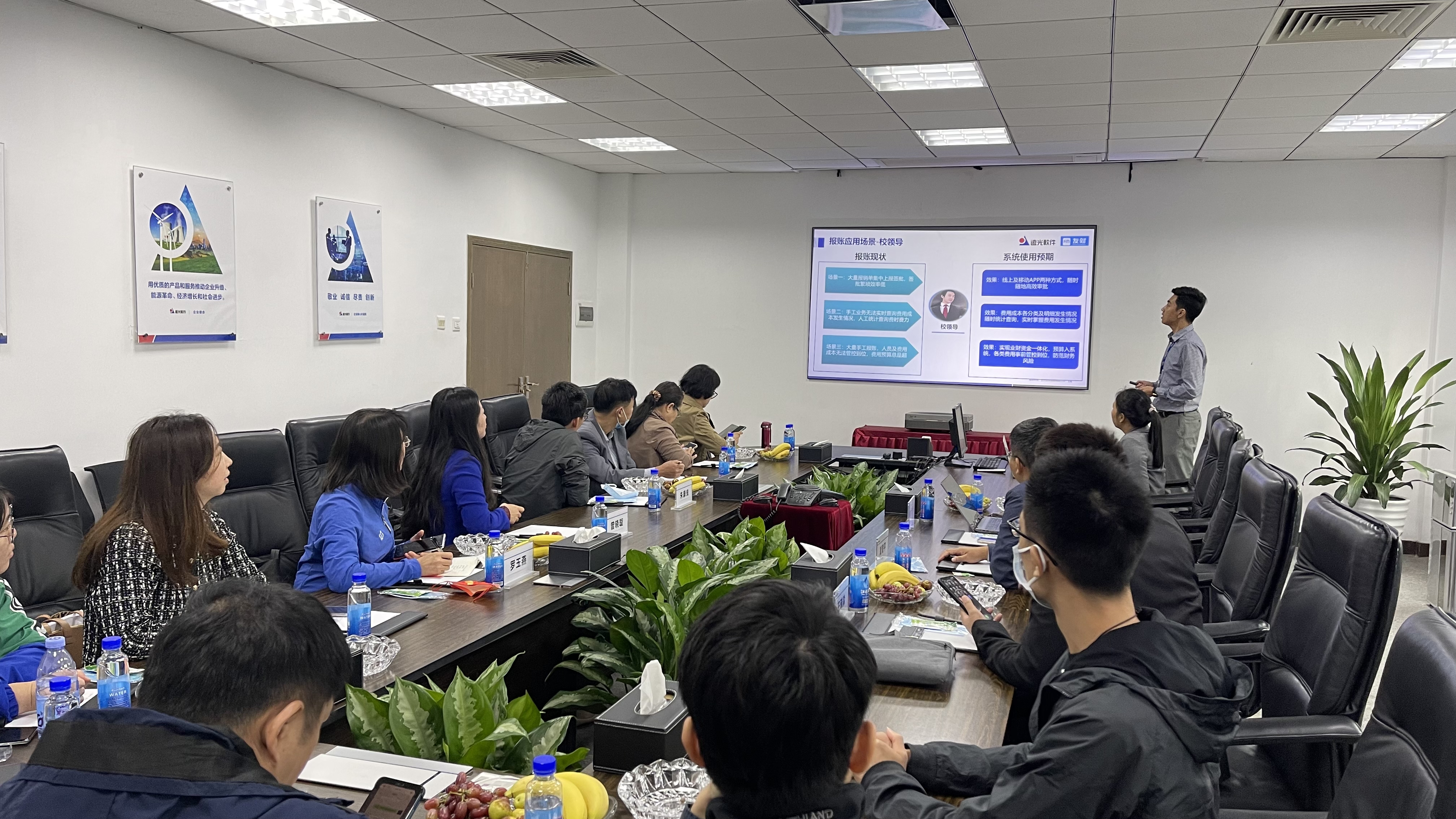 最后,调研团队来到了公司会议室。南方区域交付总监颜大帅分享了公司团队的项目经验,其后重点介绍了远光财务系统的技术与应用。